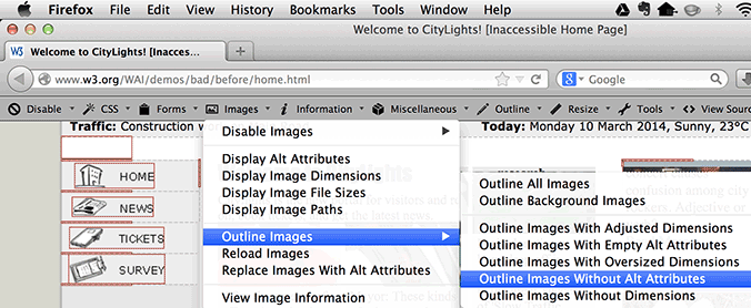 Next use the Inaccessible Home Page www.w3.org/WAI/demos/bad/before/home with one of the checks above to turn off images, disable CSS, and linearize.