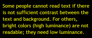 Information in podcasts or other audio is not available to people who are deaf or some people who are hard of hearing, unless it is provided in an alternative format such as captions and text transcripts. Visual information in videos is not available to people who are blind or some people what have low vision, unless it is provided in an alternative format such as audio or text. (Text can be read by a screen reader or Braille display, or enlarged and reformatted for people with low vision.)