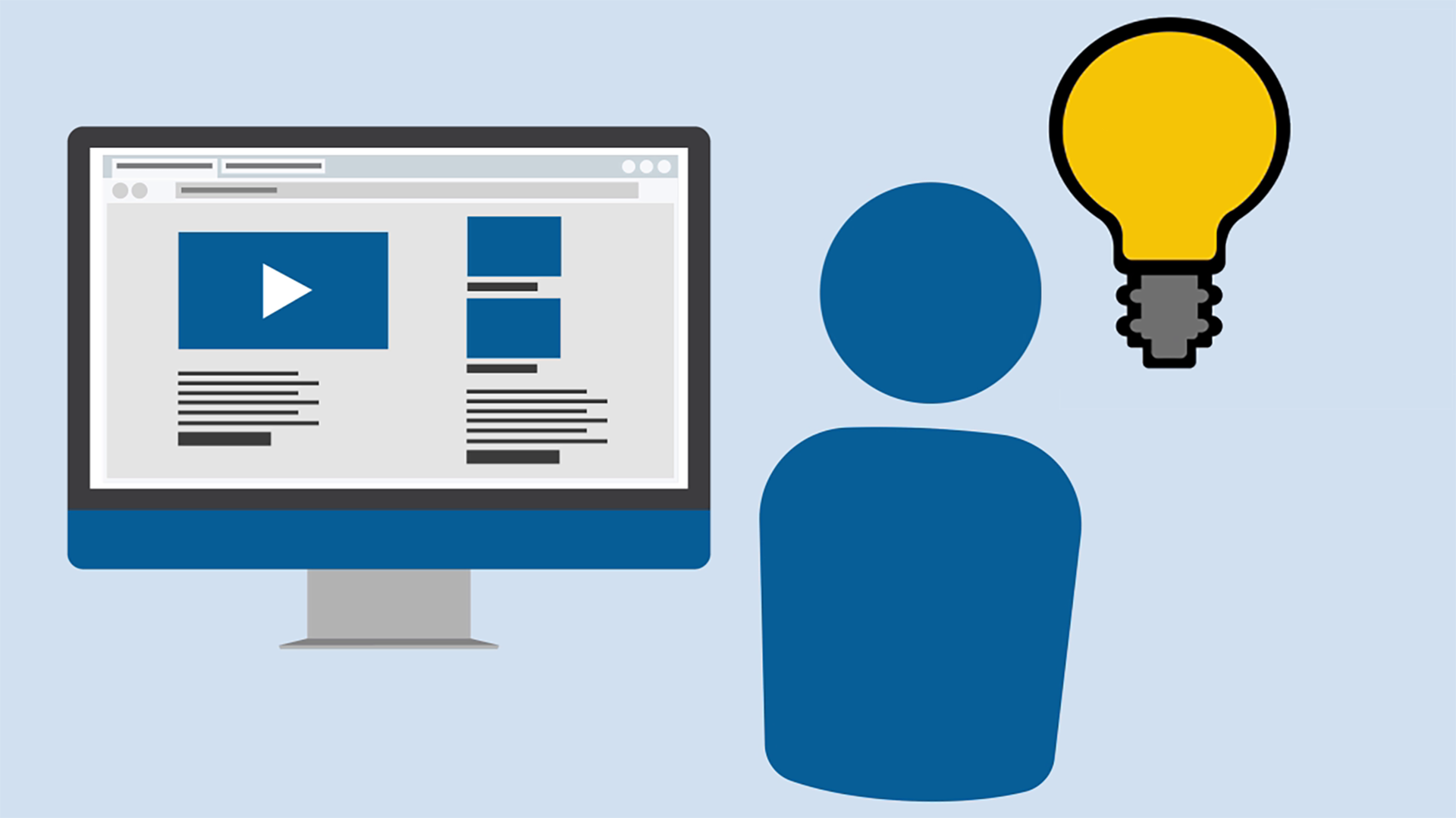 A person in front of the computer checking a website with passes and fails. The words new and non-technical are displayed. Icons around a computer: hand; eye; brain; ear and mouth with sound waves.